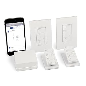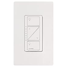 2 Caseta Wireless In-Wall Dimmers-Turn ceiling lights on/off or raise/lower to adjust brightness. -Replaces your standard toggle switch, no neutral required. -Controls up to 600 watts of incandescent/halogen, 150 watts of dimmable LED/dimmable CFL (See list of compatible bulbs). -Also works with a variety of home automation systems. -Screwless wallplates included. |